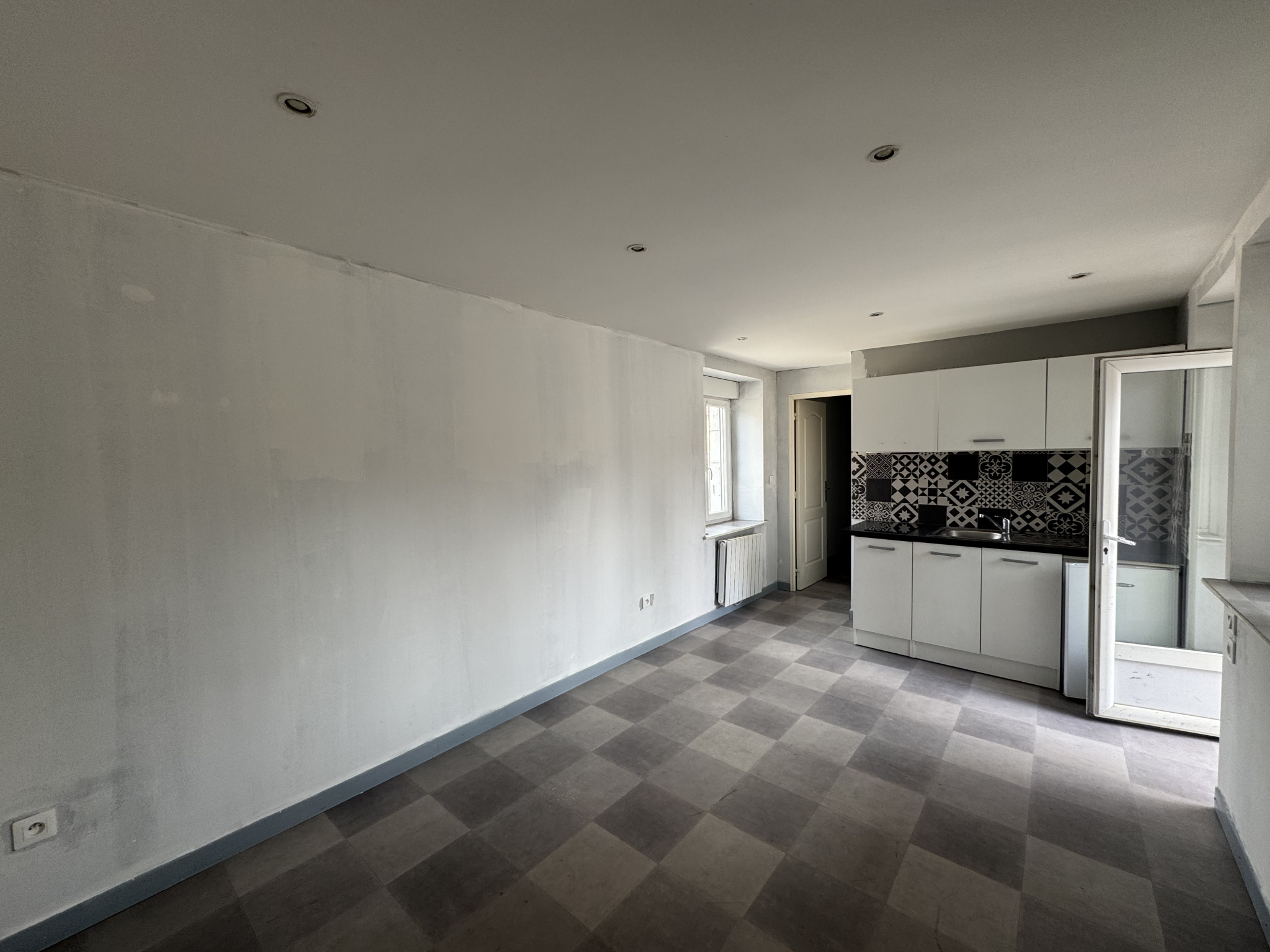 Appartement comprenant un hall d'entrée, une pièce de vie avec coin cuisine semi-équipée, une chambre avec salle d'eau attenante.
