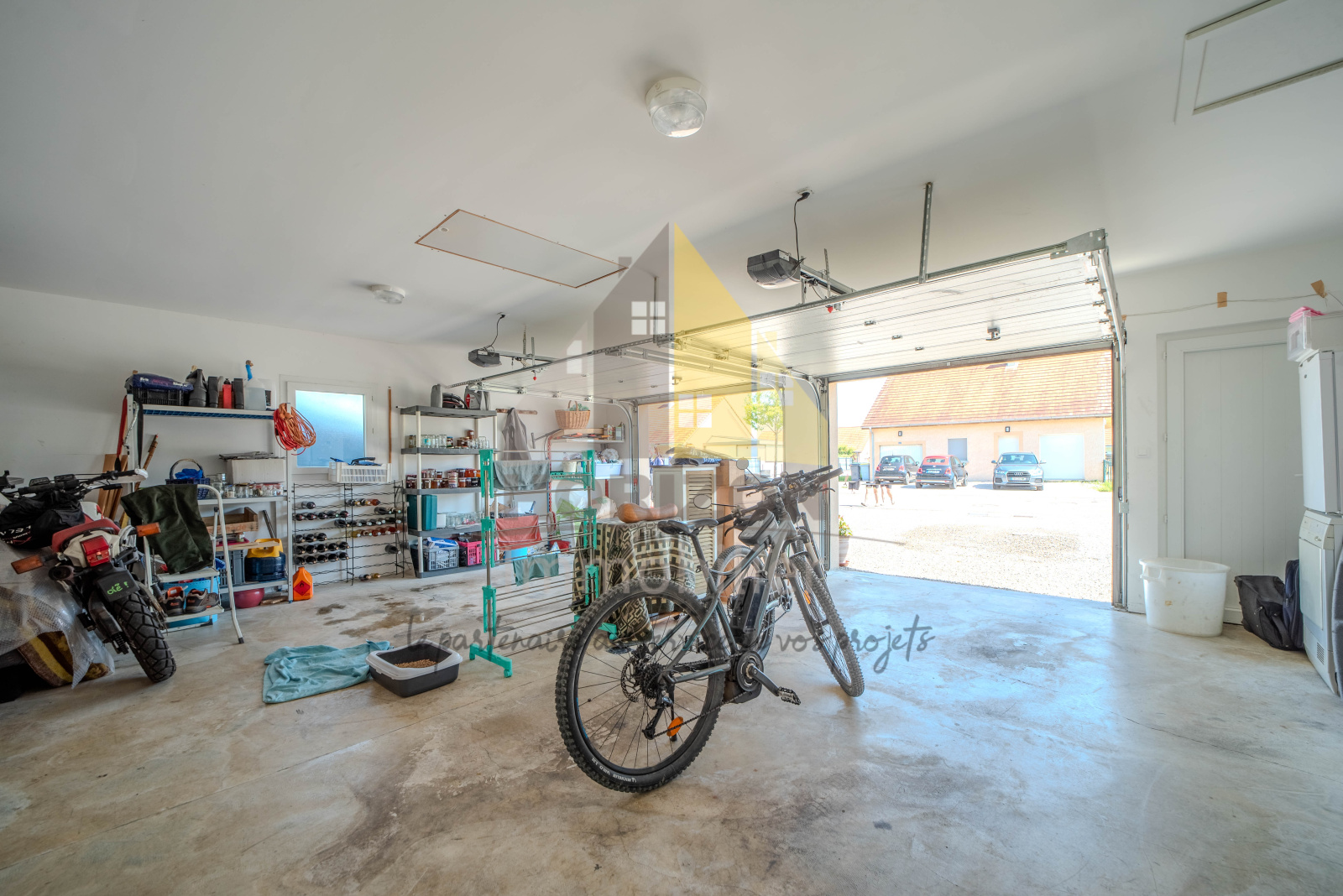 En plus, ce bien comprend un double garage avec des portes sectionnelles motorisées accolé à la maison, ainsi qu’une grande cour.