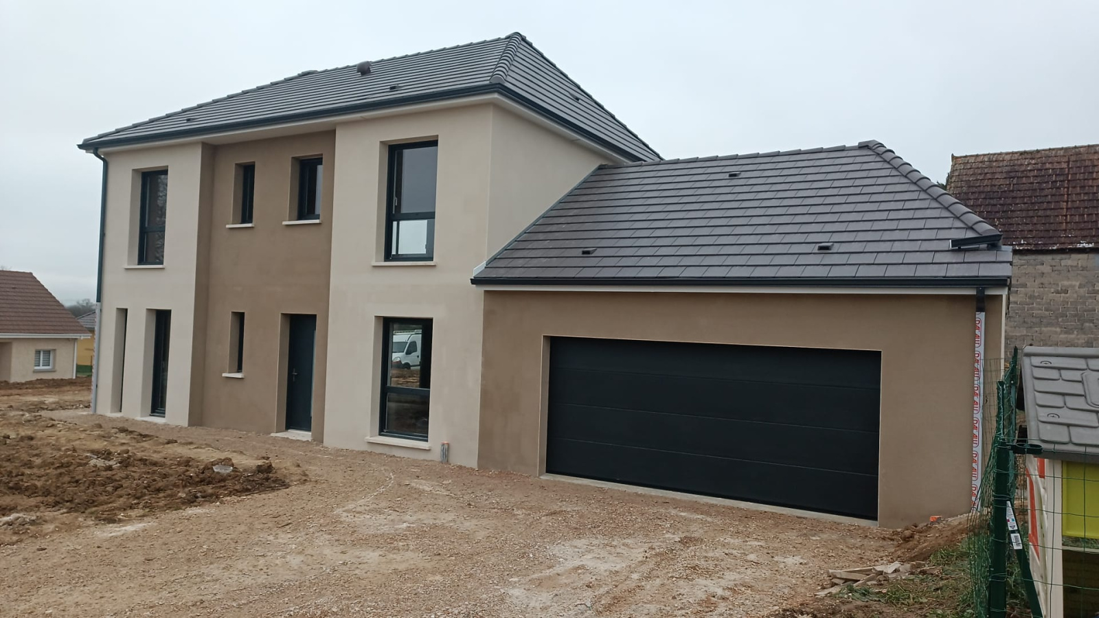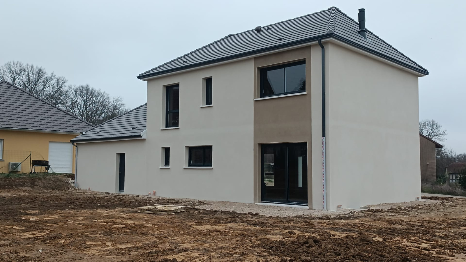 Au cœur du village du Miroir, cette maison neuve modèle DELPHÉ 13 incarne la nouvelle génération de constructions performantes et pensées pour le confort. Déjà hors d’eau, hors d’air, avec un terrassement entièrement réalisé et un crépi fraîchement appliqué, elle offre une base solide pour un acquéreur souhaitant prendre la suite du chantier avec sérénité.