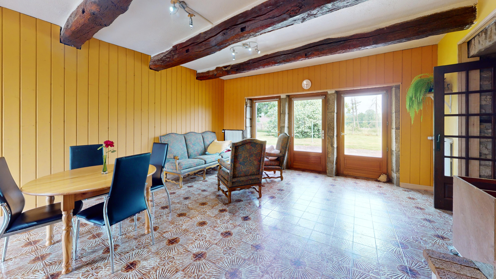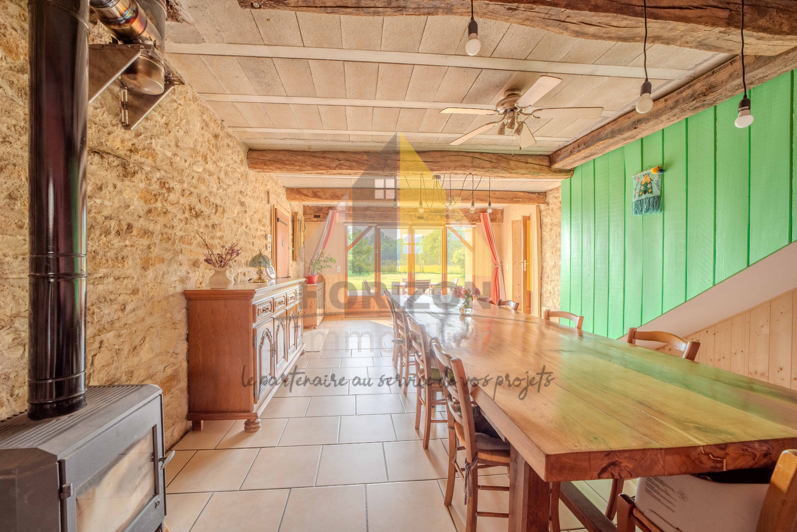 Vous serez séduits par le cachet de cette maison : des murs en pierres, des poutres apparentes, de beaux volumes avec une belle hauteur sous plafond.