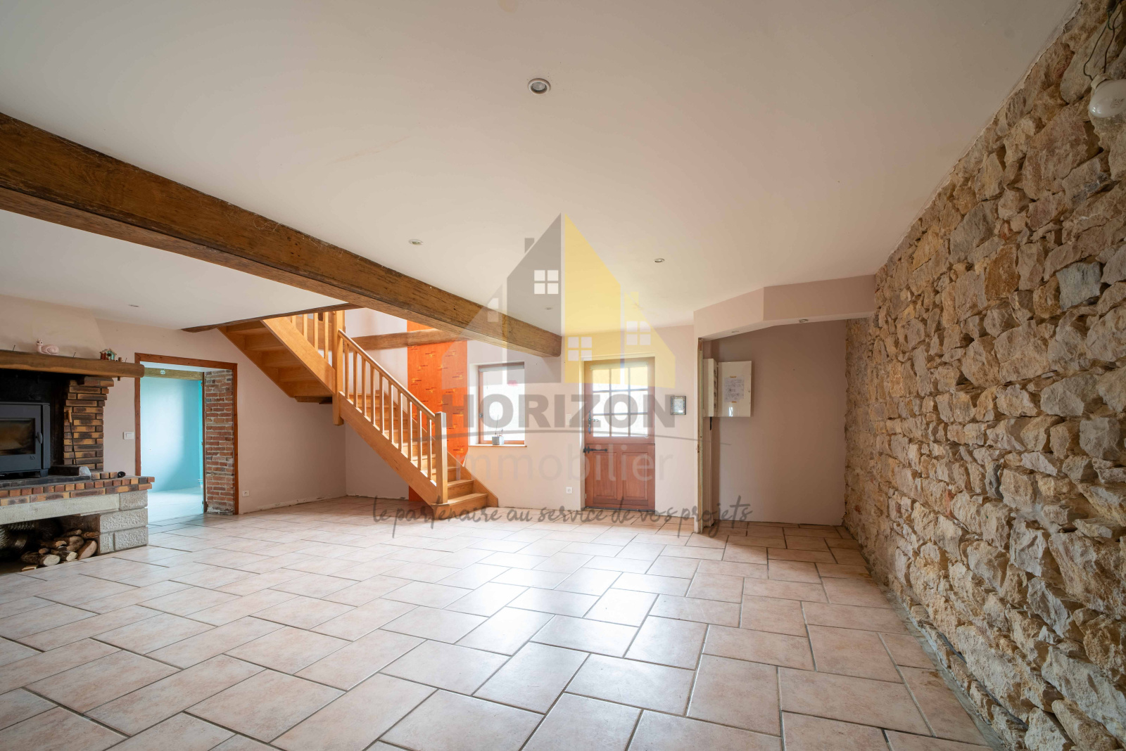 La maison se compose de plain-pied d'une entrée sur un séjour avec son mur en pierres apparentes, d'une cuisine dinatoire équipée avec son cellier, deux chambres avec sortie vers le terrain, d'une salle de bains et d'un WC.